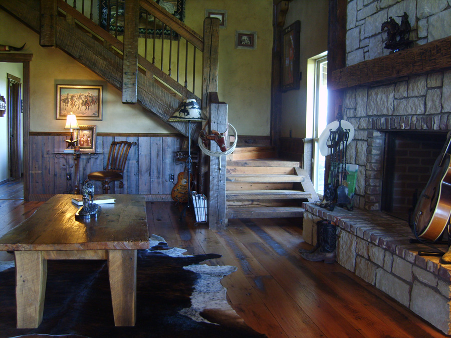 Great Room with Reclaimed Beams,Wall Paneling,Stairs, Ceiling and Flooring