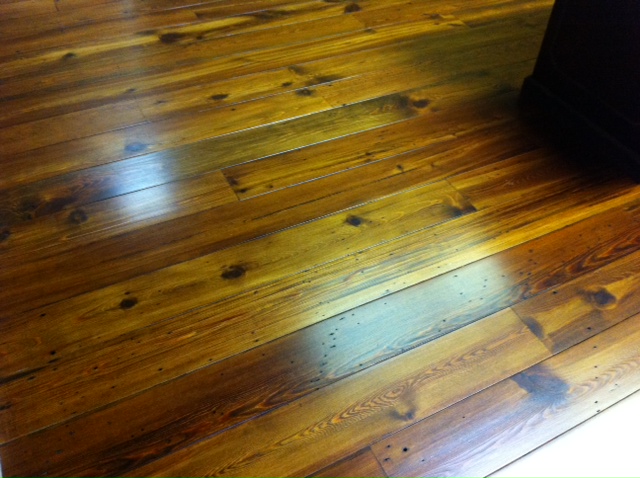 Heart Pine floor from Sweetwater Mill Beams. Boards are 14" wide x 25 feet long.