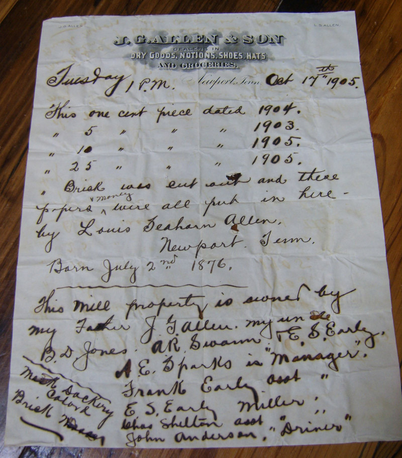 Our workman related how he and his son were chipping off the mortar from his bricks when one of them revealed a hole carved into the top. In the hole a snuff can had been placed. Retracting the snuff can, and not so carefully opening it, they discovered inside five coins and a letter dated October 17, 1905. It was written by Louis Seahorn Allen, born July 2, 1876. In the letter, he listed the coins with their dates and gave the names of the managers of the mill, and the Mill owner, who was his father. The story made front-page news in the Newspapers of the area.